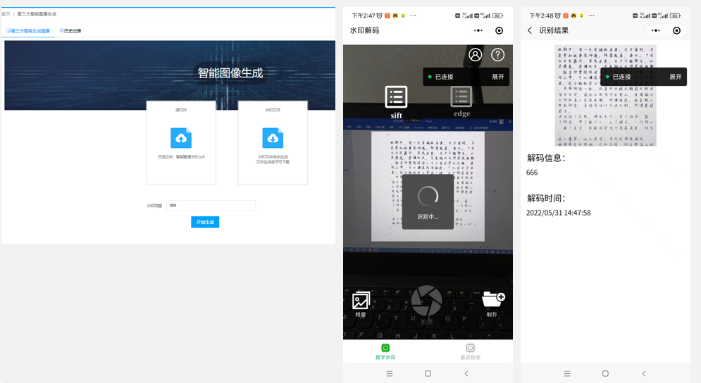 智能图像技术是我公司独立研发,使用人工智能技术研发的一种前沿的信息安全技术。该技术能够将自定义信息隐藏嵌入到文档中,使得肉眼不可见,通过专用软件进行查验。在文档中嵌入智能图像技术,可在不改变文档外观的情况下,为文档添加防拍照截屏、打印溯源、打印防伪等特殊功能