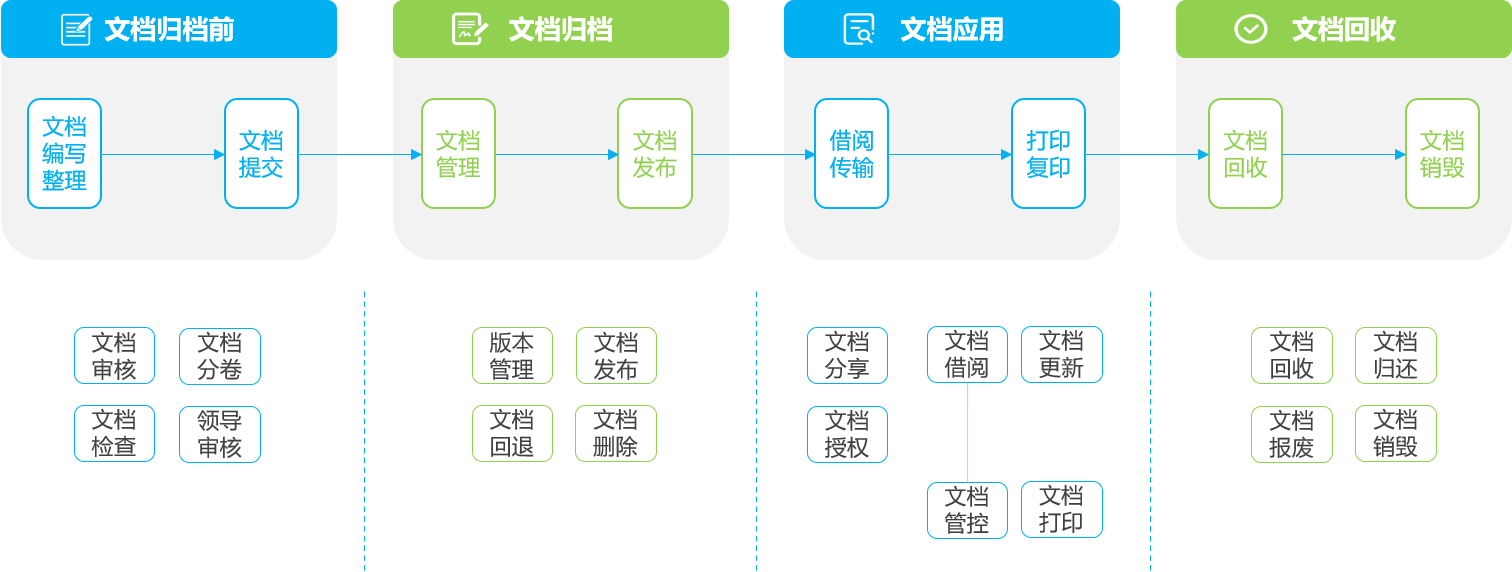 电子文档的全生命流程包含了电子文档的编撰管理审核到电子文档存档管理,再到文档的发布、借阅和撤销、回收、废除等全部流程。