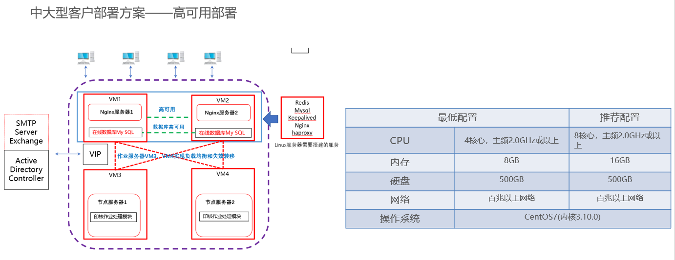 因中大型文档量大,客户现场环境较为复杂,故推荐使用高可用架构,并把数据库独立部署,同时硬盘容量根据文档增量来进行可扩容计算,转速推荐在7200rpm或以上。