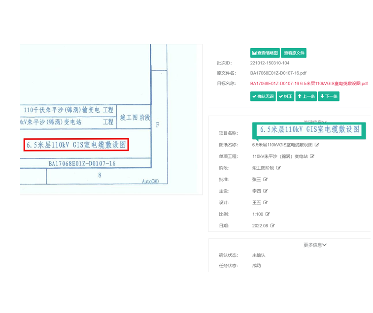 针对A0-A2的图纸重命名及关键信息录入工作,一份图纸的平均处理时间约5-7分钟,一天处理约60-84张(连续7小时工作),一个月(23个工作 日)处理量平均约1650张,按人均成本7000元/月计算,单张图纸处理成本高达4.2元张,且录入信息的准确性及整套图纸的完整性无法确保;